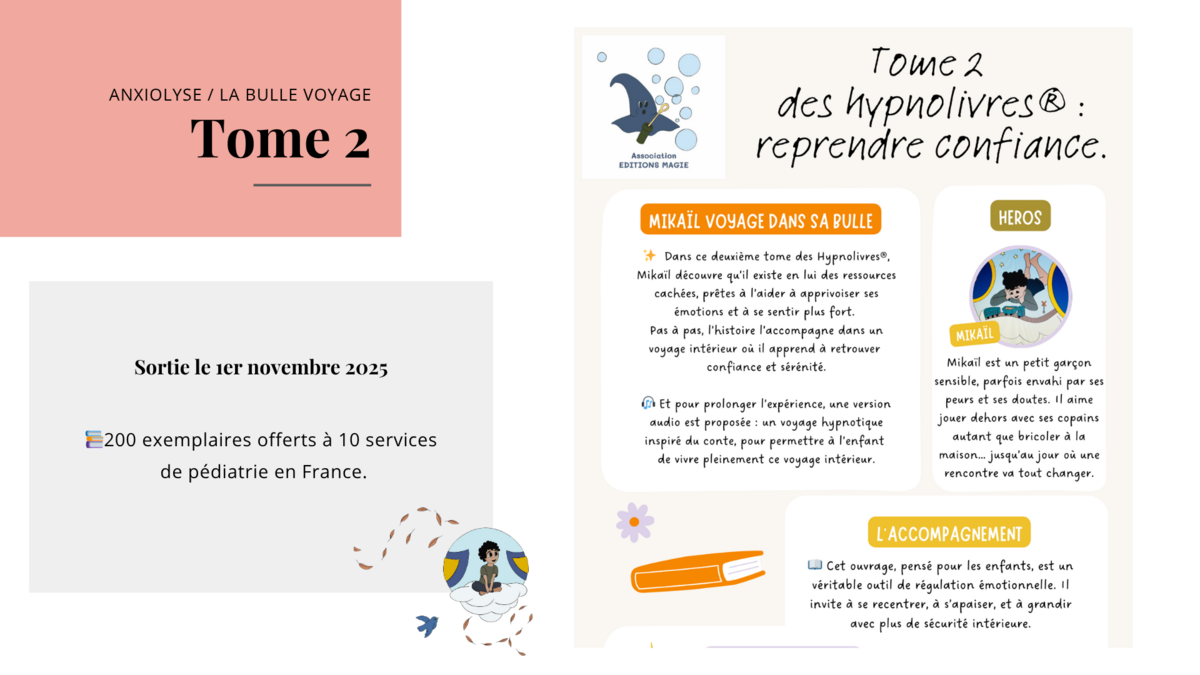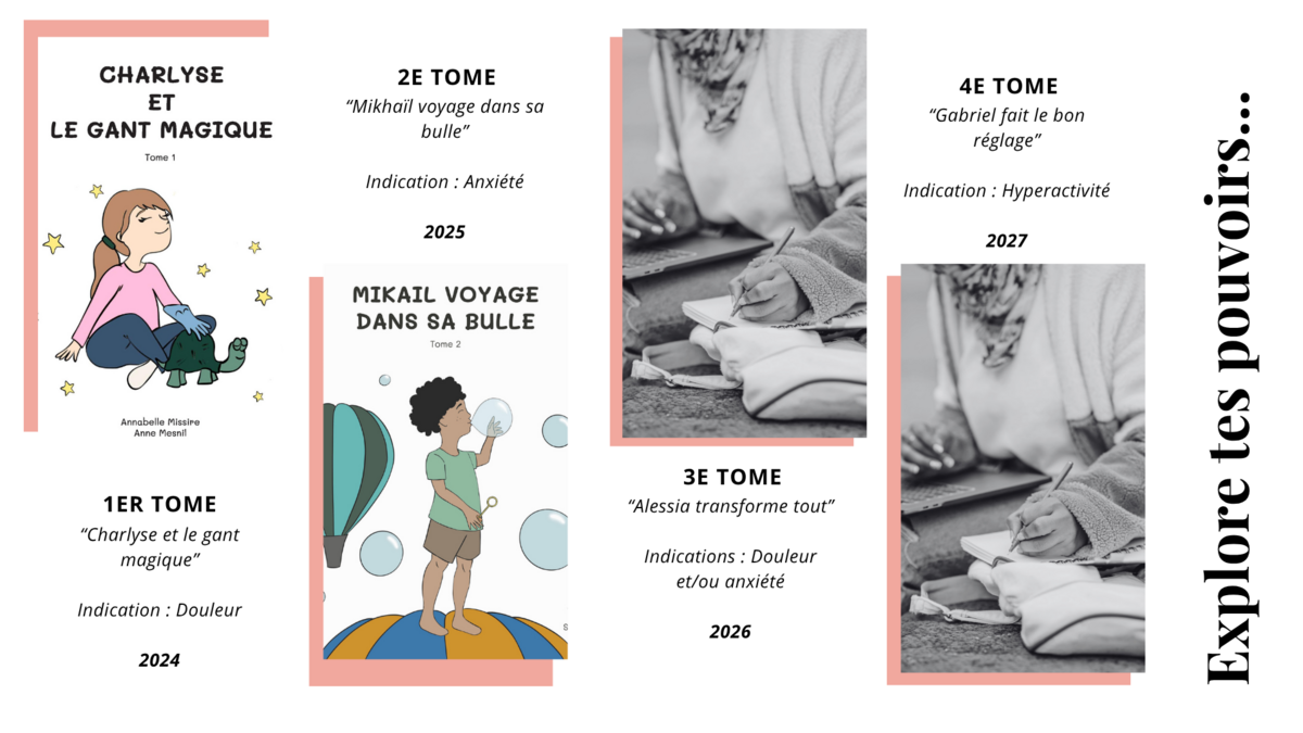 "Charlyse et le Gant Magique" (sorti en juillet 2024) illustre une technique d’analgésie par l’hypnose. Le second tome “Mikaïl voyage dans sa bulle” sortie en novembre 2025 illustre une technique pour réduire l'anxiété et reprendre confiance. D'autres tomes suivront, au rythme d'un par an.