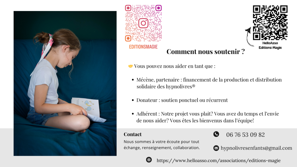 Chaque livre contient un QR code donnant accès à un enregistrement audio, pour guider l’enfant dans son expérience hypnotique.