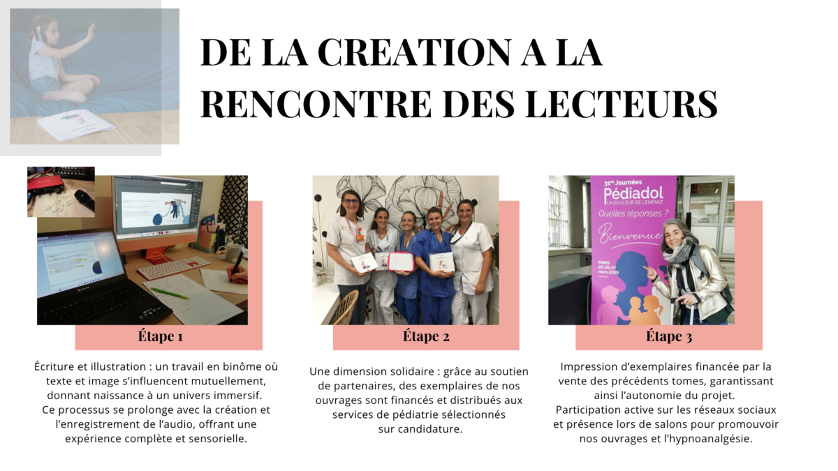 Nous avons créé une collection d’hypnolivres® jeunesse pour rendre accessibles aux enfants, parents et professionnels les techniques d’hypnoanalgésie qu’Annabelle utilise en pédiatrie et enseigne aux soignants avec l’Institut Français d’Hypnose.