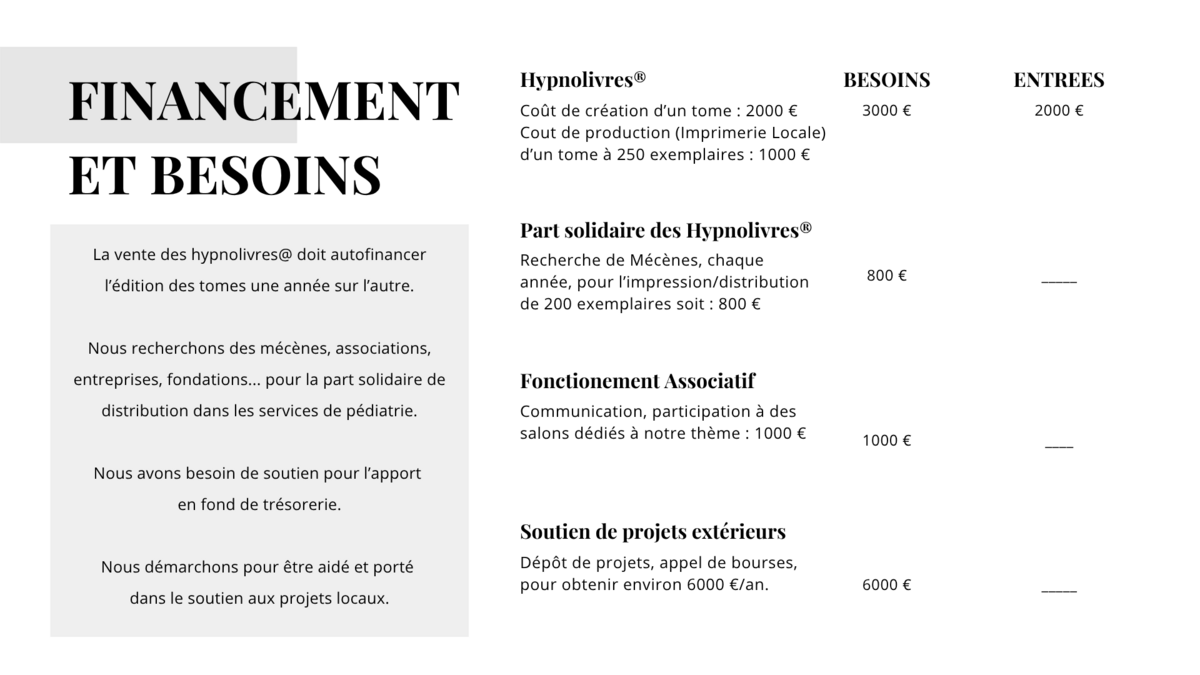 Notre association a pour mission d’éditer ces ouvrages. Les fonds récoltés permettent de promouvoir les livres dans des salons spécialisés comme Pédiadol et de financer l'impression des tomes successivement. Une partie solidaire s'attache à chaque tome, puisque nous trouvons des financeurs extérieurs pour offrir aux services de pédiatrie des exemplaires chaque année. (Rotary Villefranche, Entreprises locales…)